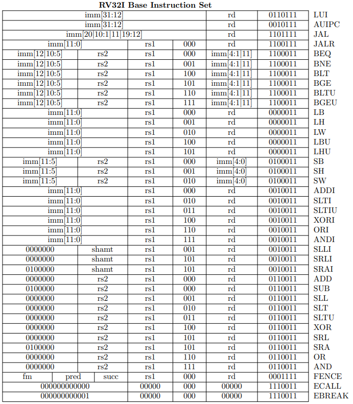 32I의 명령어들은 위의 표와 같다. 각 명령어는 다음과 같은 의미를 가진다.