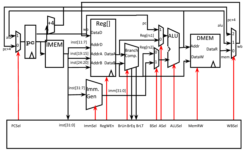 ImmSel은 5가지 각기 다른 Immediate들 중 어느 것을 선택할지를 제어하며, PCSel은 PC+4를 다음 PC 값으로 할지 혹은 ALU의 출력을 다음 PC 값으로 할지를 제어한다.