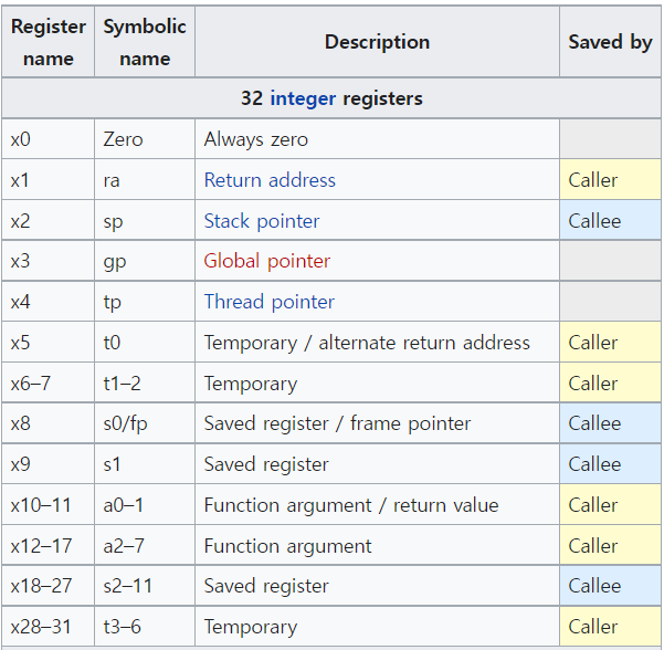 Register file은 32I의 경우 총 32개가 쓰이는데, 아래와 같이 분류된다.