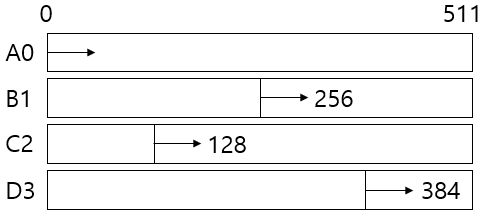 또한 A, B, C, D의 시작 address는 각각 11'h000, 11'h300, 11'h480, 11'h780 일 것이다. 이를 2진수로 나타내면
