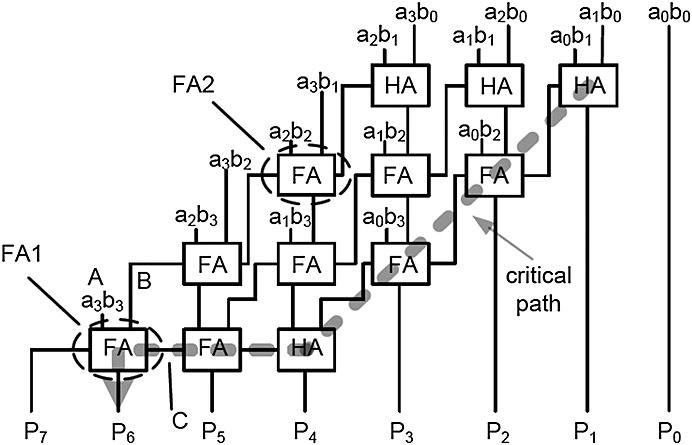 8비트로 저런 곱셈기를 만들면 critical path가 2*HA(Half Adder) + 13*FA(Full Adder)가 된다. 16비트가 되면 당연히 이보다 더 긴 시간이 걸릴 것이다.